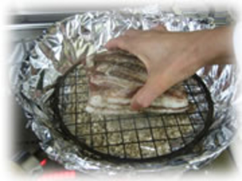 | 7・鍋の底全体に燻製チップを広げるように置きます。 | 8・鍋を中火にかけ煙りが出てきたらアミをかけ上に肉をのせます。 | |