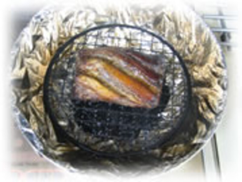 | 9・アルミホイルを鍋を包むようにして蓋をします。中火で約40分間燻製します。 | 10・蓋をはずしベーコンの中程を切り、出来具合いを確かめます。まだ火が通っていない時はもうしばらく煙りをかけます。 | |