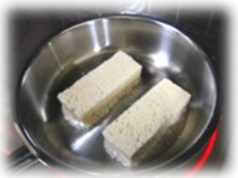 | 3・フライパンにサラダ油をひき、弱火で各面をしっかりと焼き固めてから返して、こんがりときつね色になるように焼きます。 | 4・あつあつのトーストにたっぷりの蜂蜜やジャムなどをかけてお召し上がりください。 | |