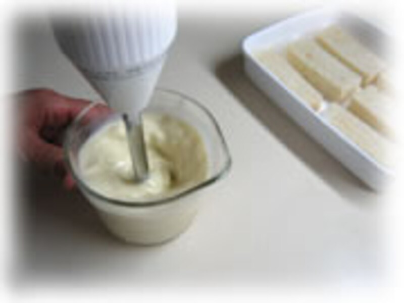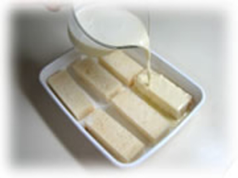 | 1・パンの耳を落とし3等分してバットに並べます。ココナッツミルク、牛乳、卵、砂糖をまぜ混ぜあわせます。 | 2・合わせたミルク液をパンの上から流し入れ、冷蔵庫で1時間ほど漬けておきます。 | |