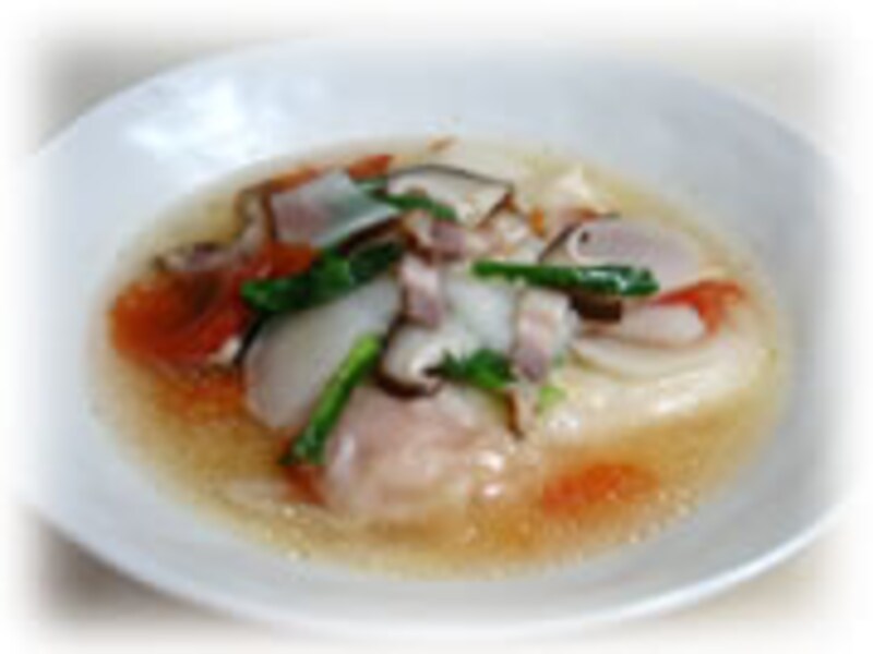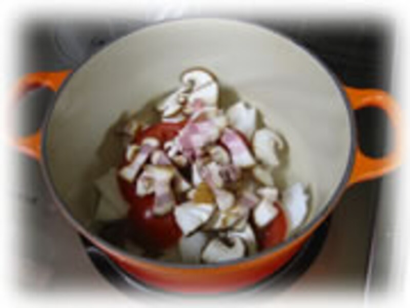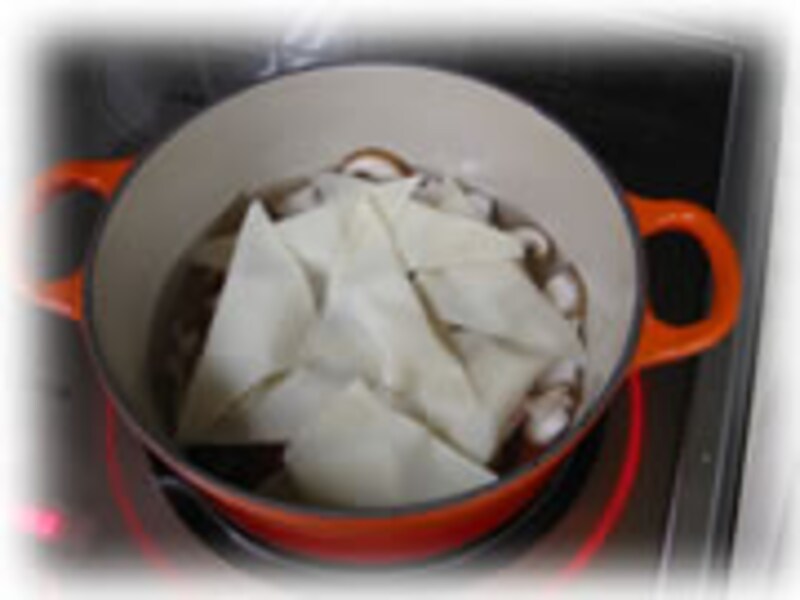 | 1・薄く切った餅をワンタンの皮で包みます。ワンタンの皮の縁に水を付け止めます。 | 2・鍋にカブ、トマト、生シイタケ、ベーコンを入れスープを加え、蓋をして中火で5分程煮ます。 | |