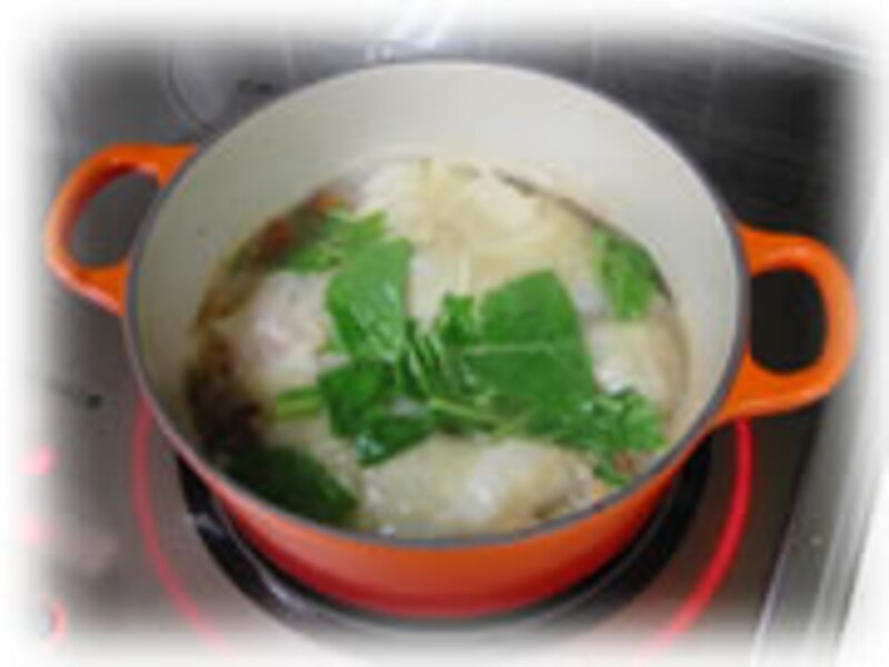 | 3・ワンタンの皮で包んだ餅を加え中火で2分程煮ます。カブの葉も加えて蓋をして1分程煮たら火を止めます。 | 4・塩、コショウで味を調えます。 | |