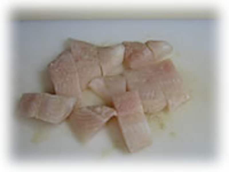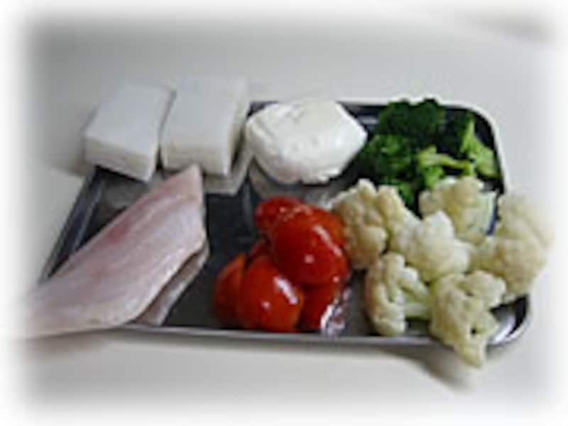 | 1・角餅は4つに切り分け、野菜類も食べやすい大きさに切り分けます。モッツァレッラも手で分けておきます。 | 2・白身魚は食べやすい大きさに切り、塩コショウをサッと振りかけます。 | |