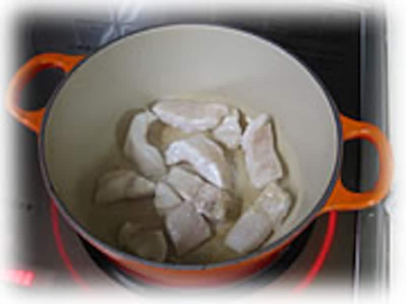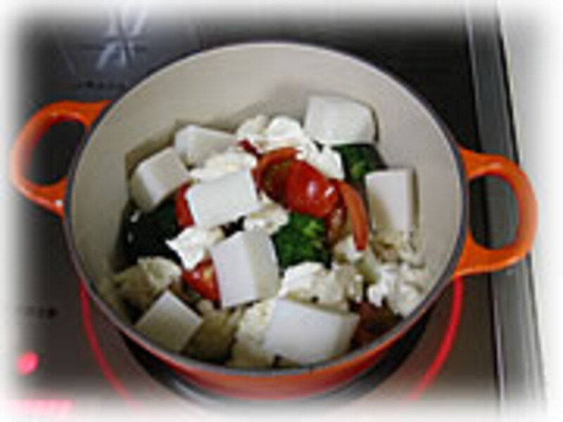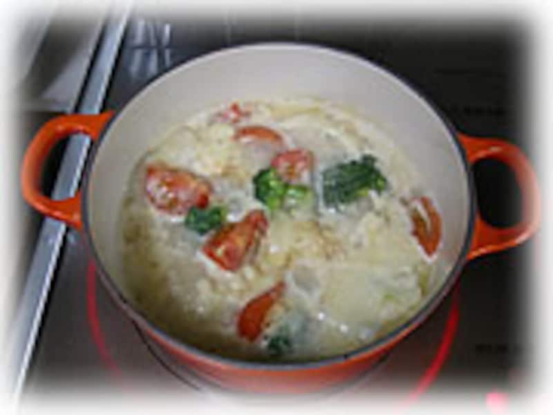 | 3・鍋を熱してオリーブオイル大さじ1で魚をさっと炒めます。 | 4・野菜類、モッツァレッラ、餅を入れ200ccの水で溶いたスープを加え中火で煮ます。 | |