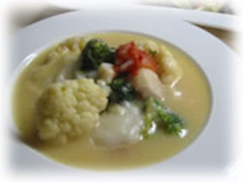 | 3・鍋を熱してオリーブオイル大さじ1で魚をさっと炒めます。 | 4・野菜類、モッツァレッラ、餅を入れ200ccの水で溶いたスープを加え中火で煮ます。 | |