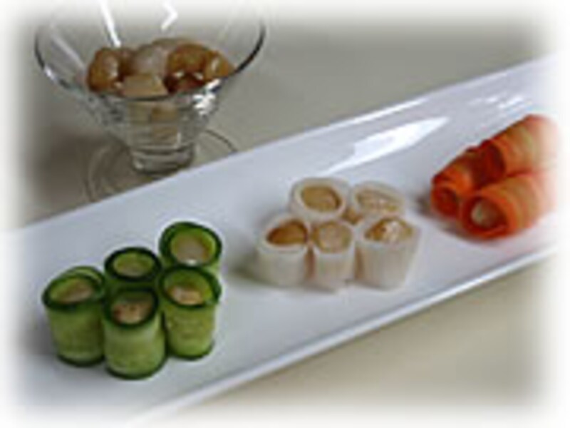 | キュウリ、大根、人参をピーラーで薄くむき、やわらかな甘味豊かな小柱の燻製を一つずつ野菜で巻きお皿に盛り付けたフィンガーフード(ピンチョス)。 | ||