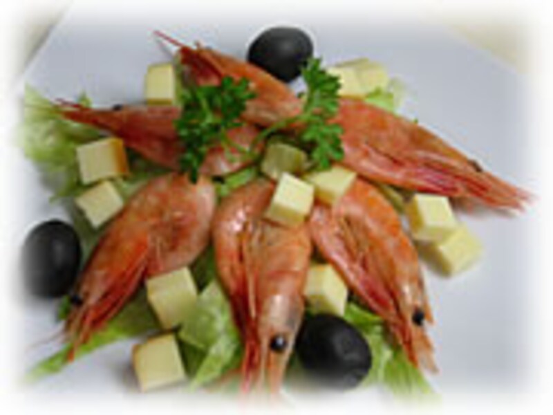 | 水切りしたレタスの上に殻をむかずにそのまま食べられる燻製甘えびを盛り付け、黒オリーブやキュービックチーズを飾ります。燻製甘えびを彩りよく盛り付け食卓が華やかになりました。 | ||