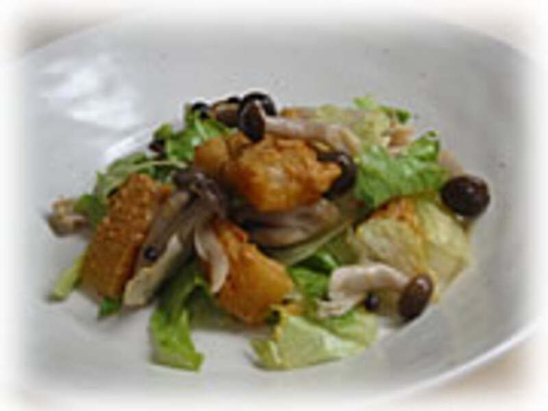 | 水切りしたレタスとさっと茹でたしめじを、生ウニと数の子をあわせたうにダイヤで和えたサラダです。 |