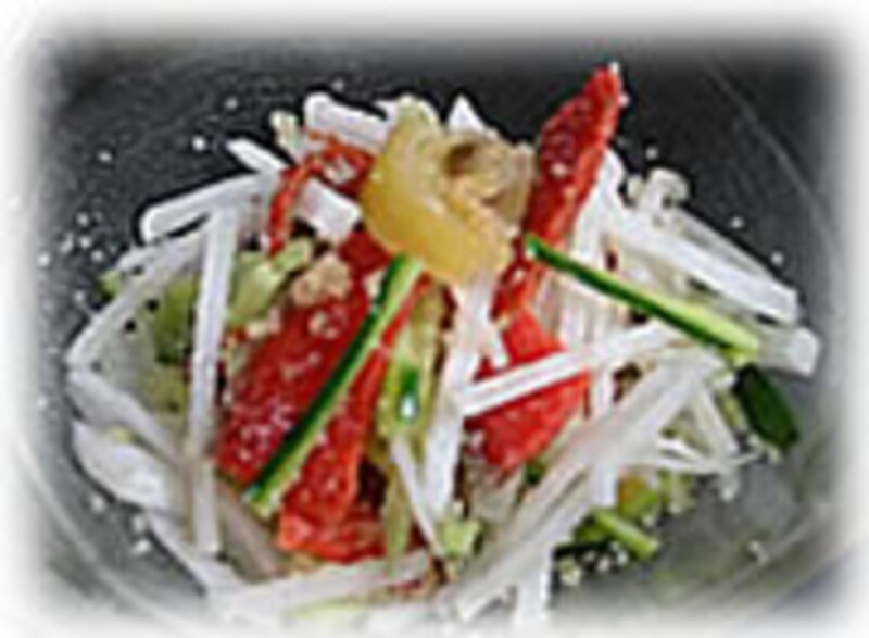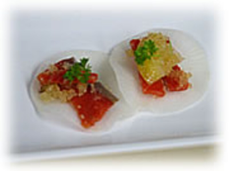 | 大根、キュウリの千切りをレモン紅さけで和えた一品。 レモンの爽やかな風味と香り、まろやかな甘酢の紅さけのうま味が野菜にしみ込みサッパリとして深みのある和え物になりました。 | 大根の薄切りにレモン紅さけとパセリを飾ったフィンガーフード(ピンチョス)。 | |