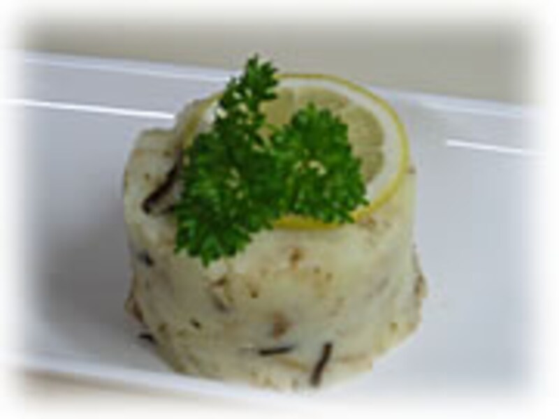 茹でたジャガイモにそばの実しぐれを混ぜ合わせ、レモンとパセリを飾ったポテト・アラ・ソバシグレ。 | |