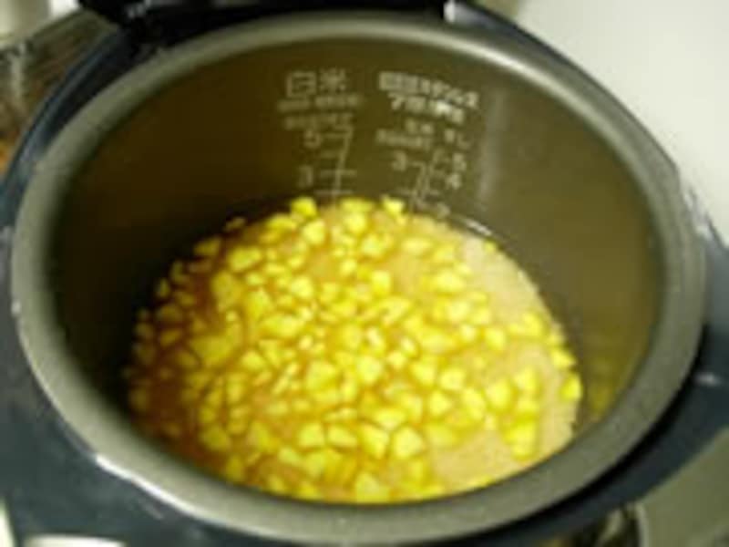 1・米2カップを洗い、ホタテ貝柱脹煮のタレと水を合わせて炊飯器の水加減目盛りを2にします。人参は細かく切り米の上にちらします。スイッチを入れ普通に炊き上げます。