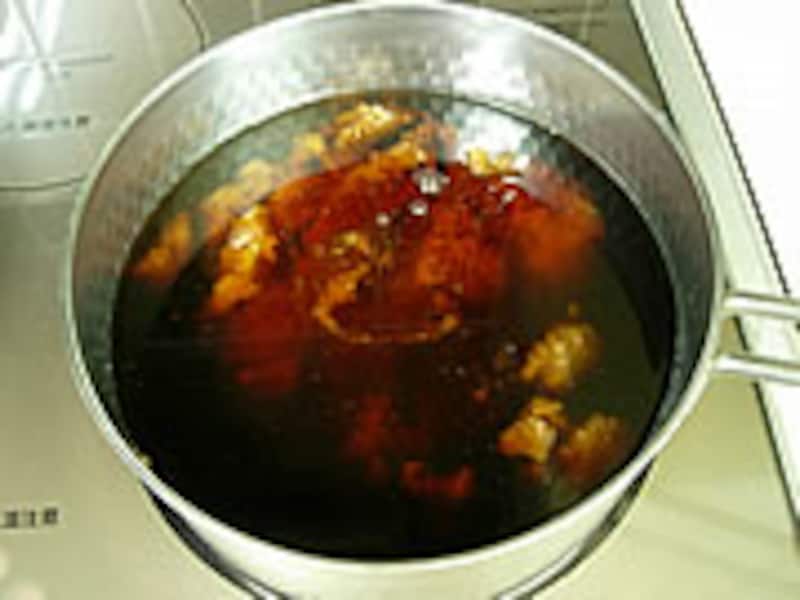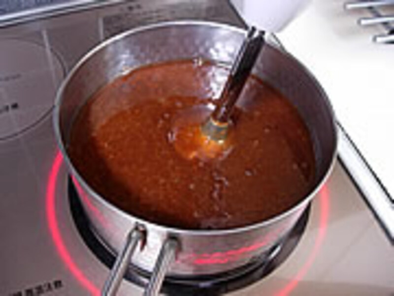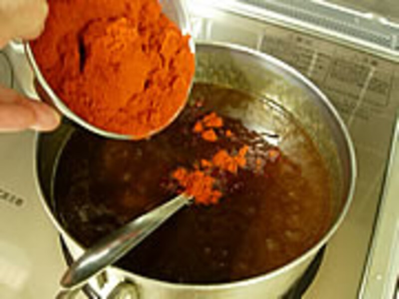 | 3・合わせ味噌が煮立ってきたら火を止めます。この後は加熱しないでひたすら練り合わせます。 | 4・粉とうがらしを少しずつ加え、なめらかになるように混ぜ合わせます。 | |