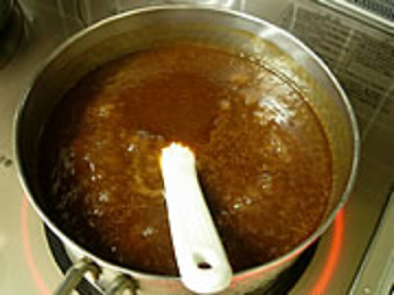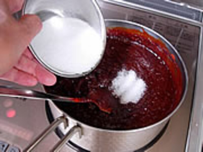 | 5・次にグラニュー糖を少しずつ加えて良く混ぜ合わせ、なめらかに仕上げます。 | 6・これででき上がりです。味噌が冷めたら保存容器に入れ冷蔵庫で保存します。2~3日すれば辛味もまろやかになります。 | |