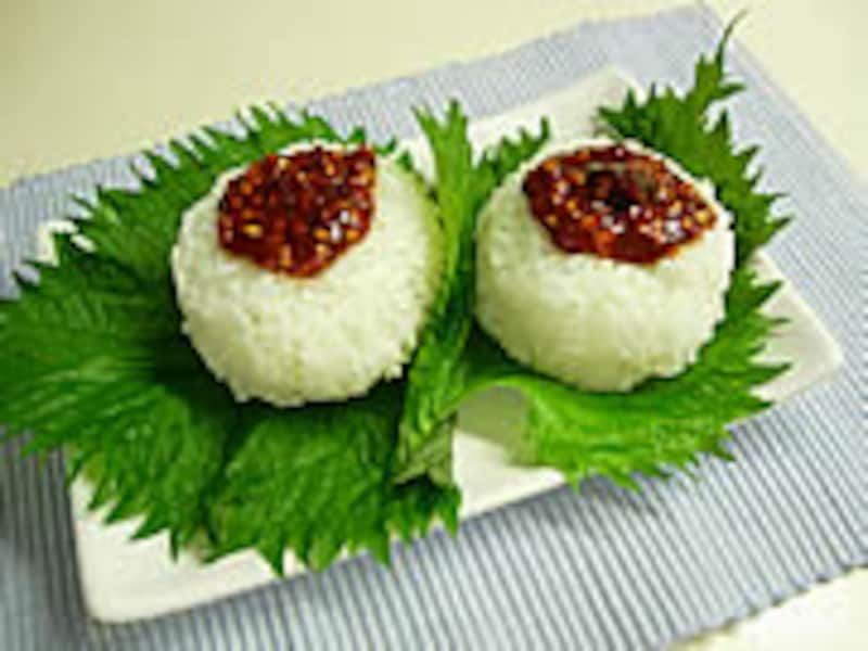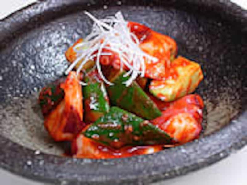 | 基本のコチュジャンにネギのみじん切り、炒りごまを加えたコチュジャンは、大葉で包んだお握りにのせたり、焼きお握りにつけていただくのも大好評です! | コチュジャンにお酢を加え、タコとキュウリの和え物はビールのおつまみにもピッタリです! コチュジャンは炒めもの、和え物、鍋物、ご飯ものなどいろいろに使えます。 |