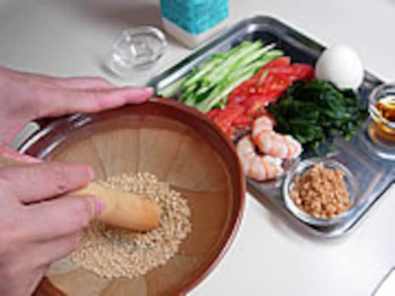 | 1・すり鉢で炒りごまを半ずりにして味噌、コチュジャン、醤油、ごま油を合わせます。 |