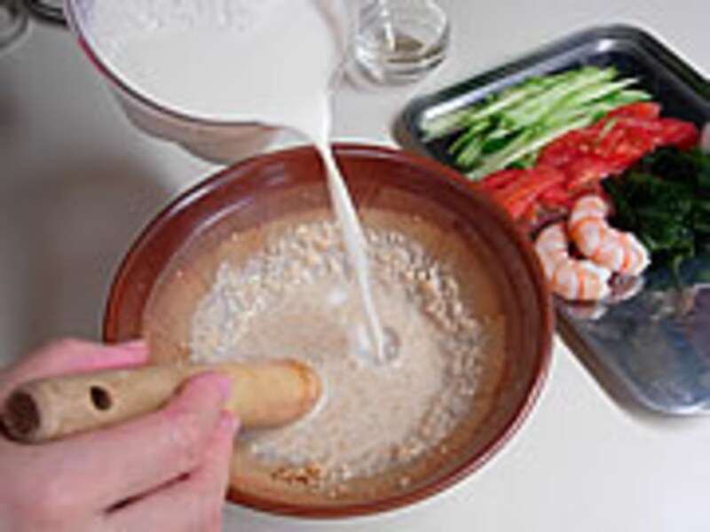 豆乳にコチュジャン、炒りごま、ごま油などを合わせた少しとろみのあるスープは