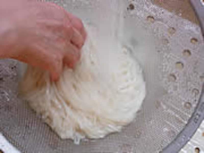 3・たっぷりの熱湯で麺を茹で冷水にとり、もみ洗いをして水気をよく切ります。麺はそうめんや乾麺の稲庭うどんがおすすめです。