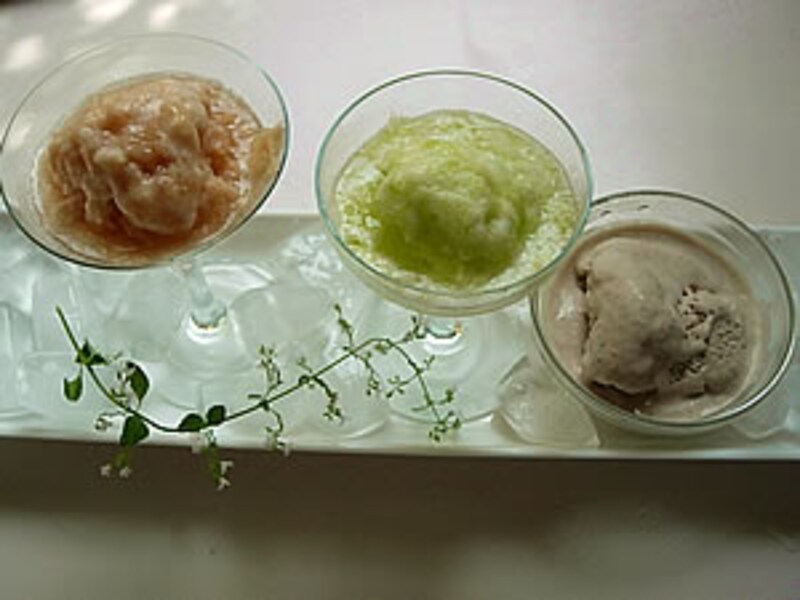 フルーツソルベ 真夏の昼下がり ひとくち含むとスーッと溶けるフルーツソルベ 旬のフルーツを丸ごと使った爽やかな甘さと リキュールの香り豊かな 手づくりソルベを楽しみください♪ ピーチソルベ 桃 3個 グラニュー糖 50g 卵白 1個分 キルシュ 大さじ1 バナナソルベ バナナ 4本 生クリーム 100cc グラニュー糖 50g 卵白 1個分 リキュール 大さじ1 レモン 1個 メロンソルベ メロン 200g グラニュー糖 50g 卵白 1個分 リキュール 大さじ1 (C)Aug.2005 Copyright Tamiko Kuroda 12次のページへ