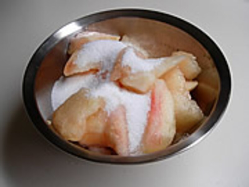 | 1・桃は皮をむき種をとり一口サイズに切り分け、グラニュー糖を振りかけハンディーミキサーでつぶしリキュールを加えて冷凍庫で凍らせます。 | 2・★みぞれ状に固まったらハンディーミキサーやスプーンを使ってよく混ぜあわせ、もう一度冷やし固めます。 ★つぎにみぞれ状に固まったら、卵白をボールでしっかりと泡立て泡をこわさないようにざっくりとかき混ぜ、もう一度冷やし固めます。 ★みぞれ状になったら器に盛り付けいただきます♪ |