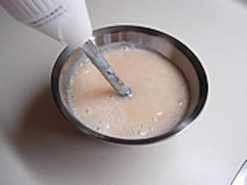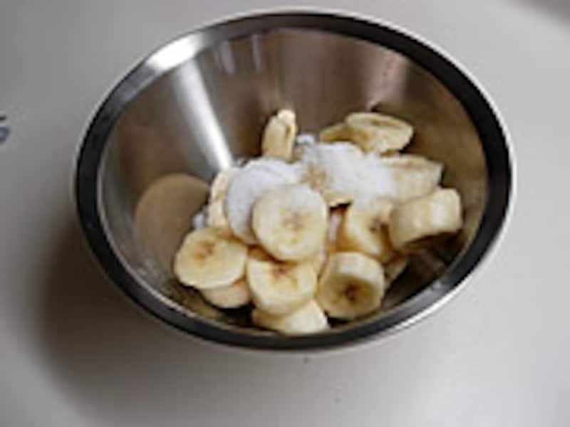 1・バナナは皮をむき1cmに切り分け、レモン汁、グラニュー糖、生クリームを加えハンディーミキサーでつぶしリキュールを振りかけて冷凍庫で凍らせます。