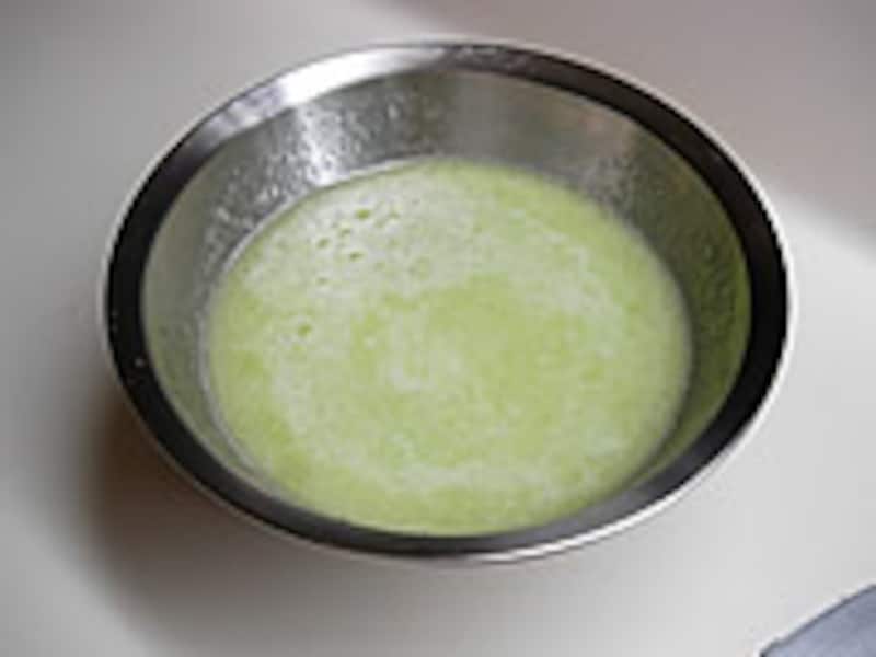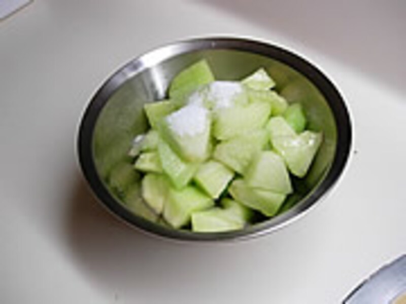 1・メロンは皮をむき2cmに切り分け、グラニュー糖を振りかけハンディーミキサーでつぶしリキュールを加えて冷凍庫で凍らせます。