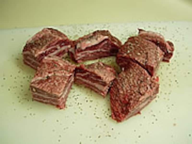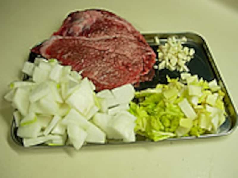 | 1・玉ねぎ、セロリ、ニンニクは粗みじん切りにします。 | 2・ほほ肉は5cm角くらいに切り分け塩、黒コショウを振りかけます。 | |