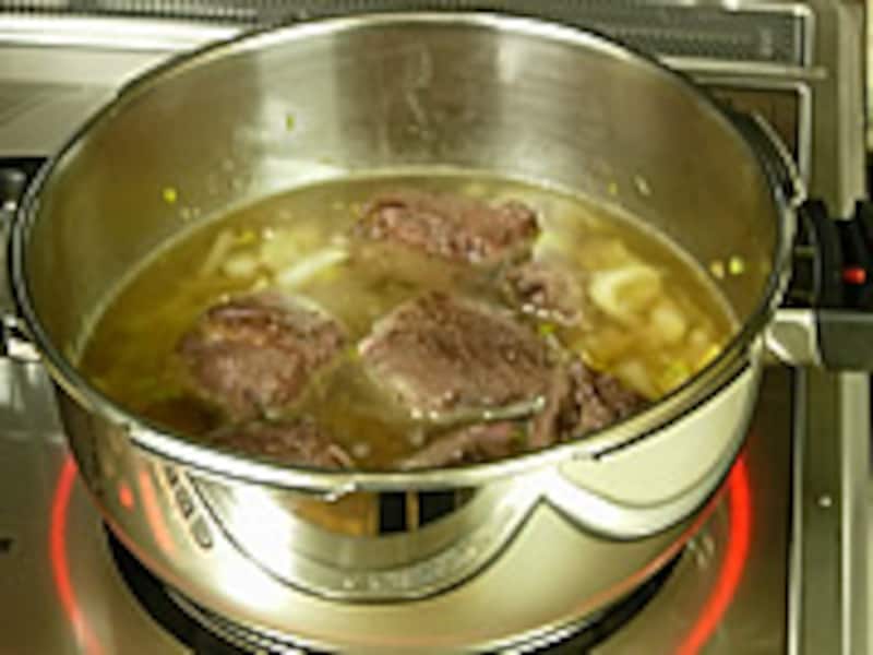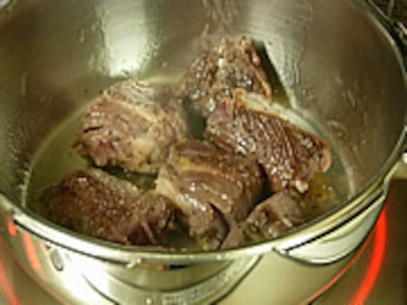 | 3・鍋にオリーブオイル大さじ1とニンニクのみじん切りを入れ、中火にかけ、ニンニクの香り出てきたら肉の表面をこんがりと炒めます。肉を取り出し玉ねぎ、セロリをしんなりするまで炒めます。 | 4・(3)に肉を戻し水500ccを加え、沸騰したらアクを取り除き中火で1時間ほど煮込みます。(圧力なべを使うと時間が短縮できます) | |
