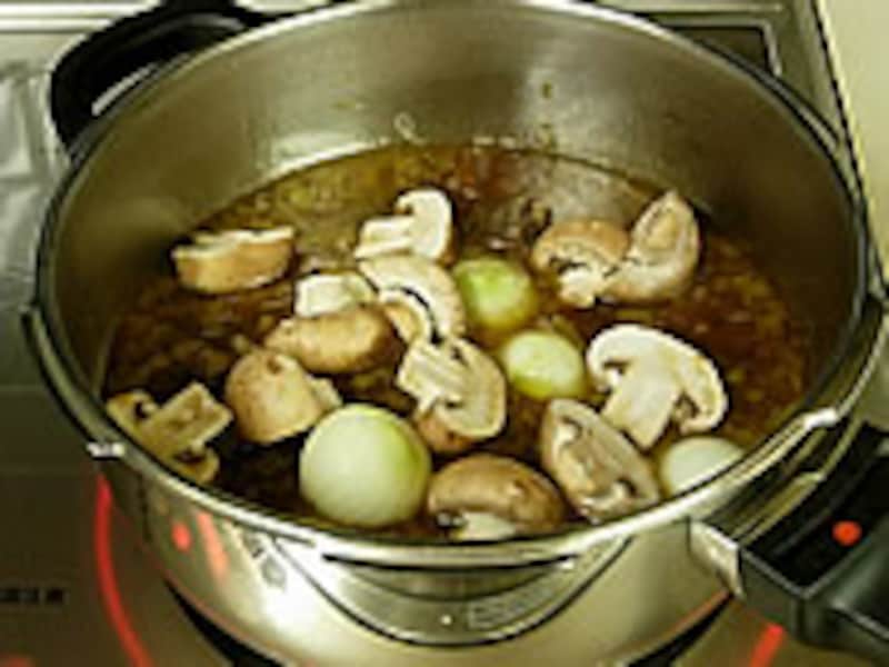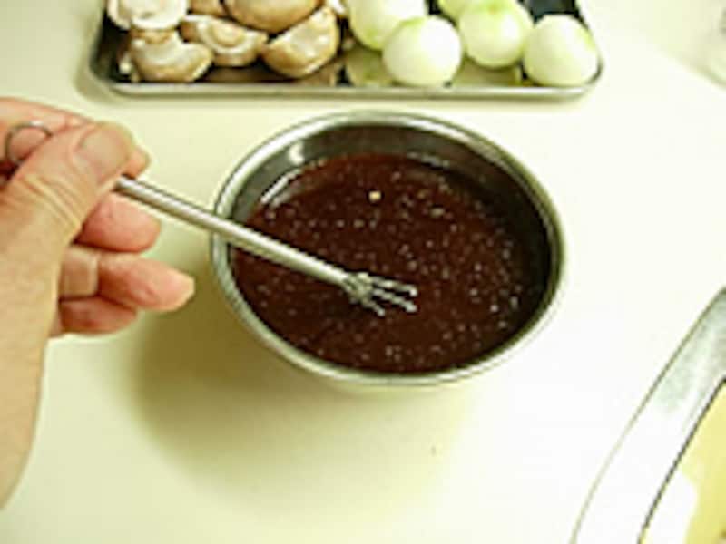 | 5・赤ワイン、味噌、砂糖を合わせてソースを作ります。 | 6・(4)の鍋に赤ワインソースと小玉ねぎ、マッシュルームを加え中火で40分ほど煮込み、塩、黒コショウで味をととのえます。 | |