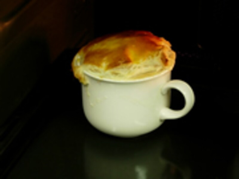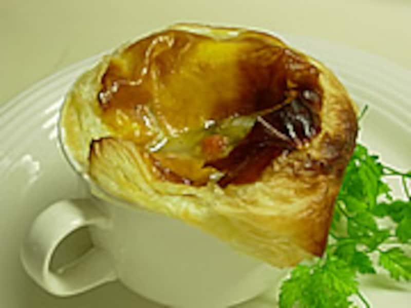 | アツアツのパイ包みのオニオンスープはパイ皮をスープの中に入れて召し上がってください♪ 玉ねぎとベーコンだけのオニオンスープにカリッと焼いたパンを添えたり、具たくさんのスープにパスタなど加えるとボリュームあるブランチに・・・簡単で温まるスープをぜひお楽しみください♪ |