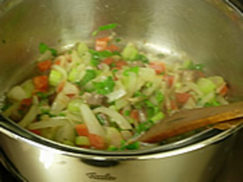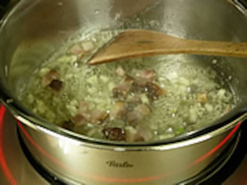 | 1・鍋にバターを入れ熱しニンニク、ベーコンを炒めます。 | 2・玉ねぎ、人参、セロリの甘味がでるようにしんなりするまで炒めます。 | |