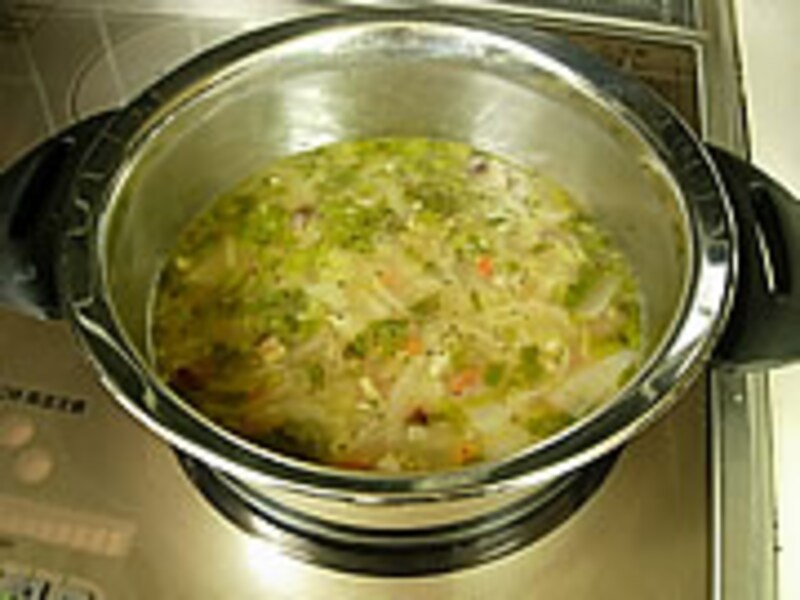 | 3・水とコンソメスープの素を加え、中火で20分ほど煮て塩・コショウで味をととのえます。 | 4・スープカップにスープを入れエメンタールなどのとろけるチーズを入れます。 | |