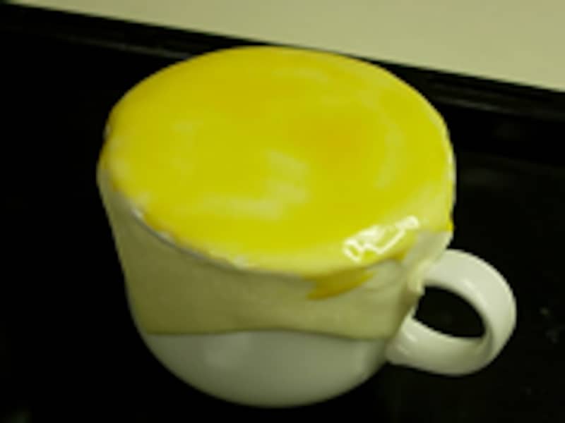 | 5・パイシートを伸ばしカップにかぶせて蓋をします。表面に溶き卵を刷毛でぬります。 | 6・230度に予熱しておいたオーブンで約8分焼きます。 | |