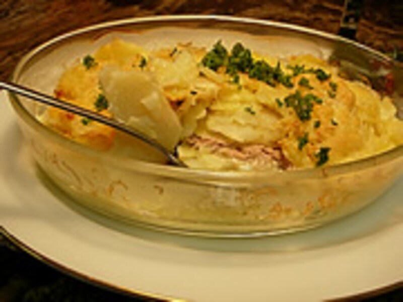 | じゃがいもは古くから食べられてきた食材で、国内でもいろいろな種類のじゃがいもが栽培されています。お馴染みの男爵いもはバターをたっぷりのせベークドポテトなどに、細長くスマートなメークインは煮くずれしにくいので煮物にむいています。じゃがいもはつけ合わせに使ったりオードブルからメイン料理までいろいろと使えます。じゃがいもはお米の約半分とカロリーも低く、加熱しても壊れにくいビタビンCやカリウムを多く含んでいます。 今回は手軽にツナ缶を使いましたが魚をソテーしたものや、ベーコンと玉ねぎを炒めたものを重ねたチーズ焼きもとても美味しくいただけます。手軽なホームパーティや休日のブランチにもおすすめです♪ |