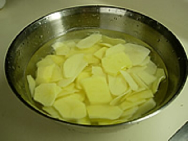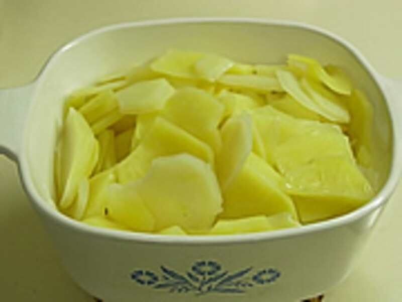 | 1・じゃがいもは薄切りにして水に2分ほどさらして水気を切っておきます。 | 2・耐熱容器にじゃがいもを入れ電子レンジ(600w)で15分ほど加熱します。軽く塩コショウで味付けします。 | |