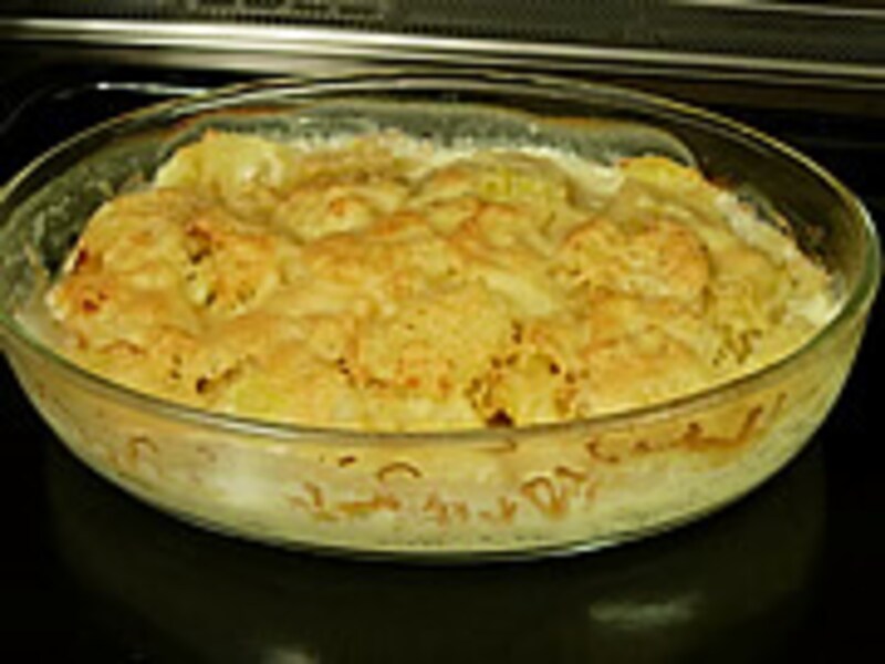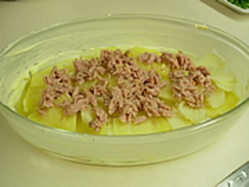 | 3・耐熱容器にバターを塗り、半分のじゃがいもを底に並べその上にツナを重ねます。 | 4・残りのじゃがいもを重ね、生クリームを回しかけ、おろしたゴーダチーズをまんべんなく振りかけます。 | |