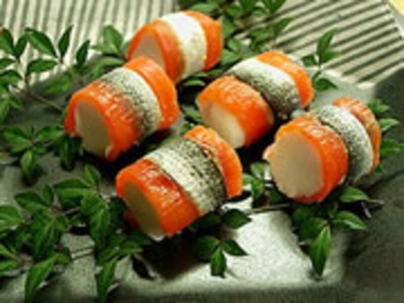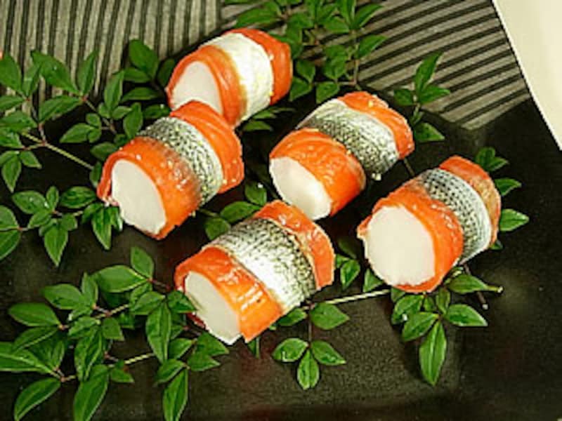 スモークサーモンとコハダを巻いた彩りも美しい一品は