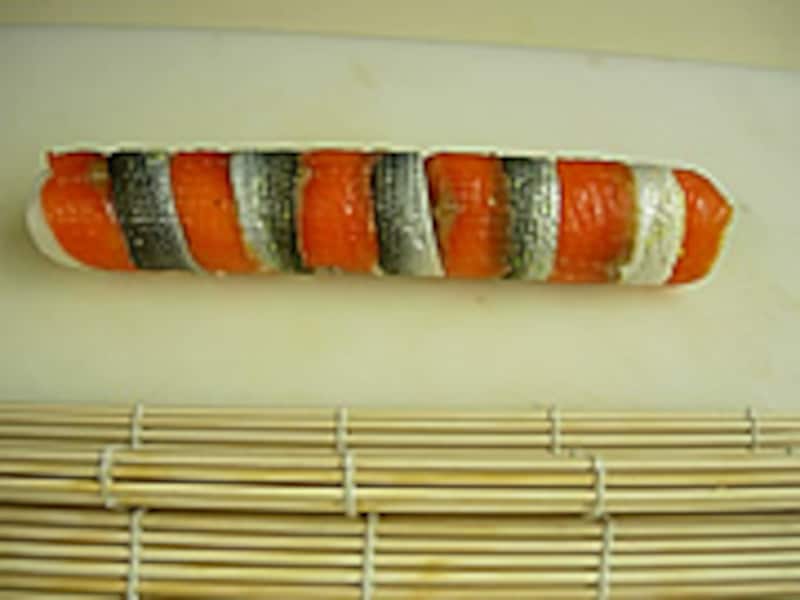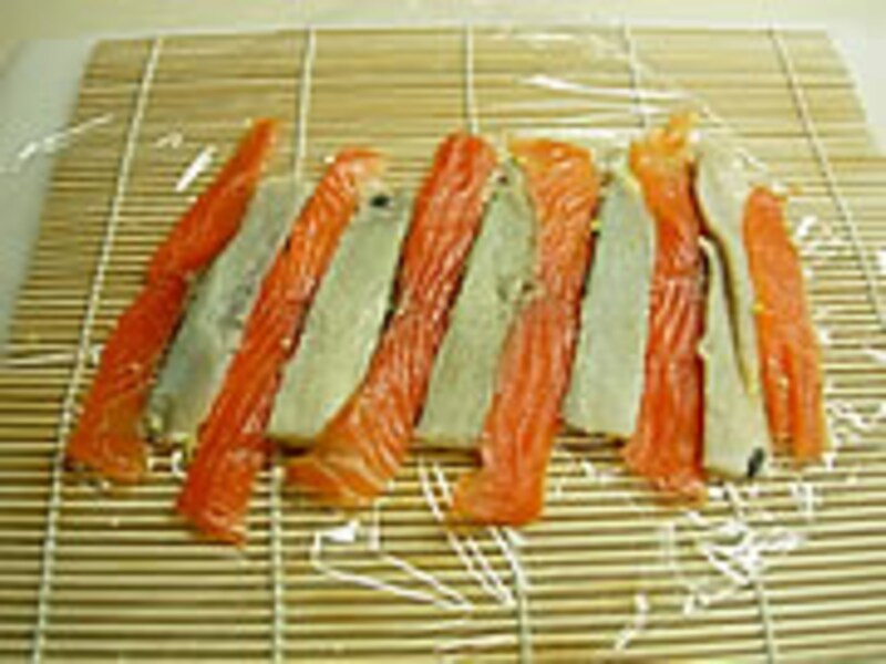 | 3・巻すにラップを敷き1.5~2cm幅に切ったスモークサーモンとコハダの酢漬けを交互に並べます。 |