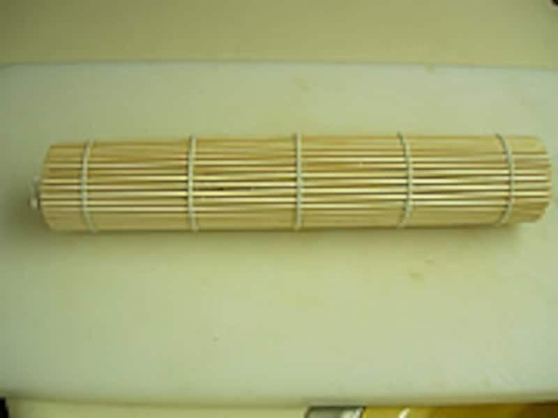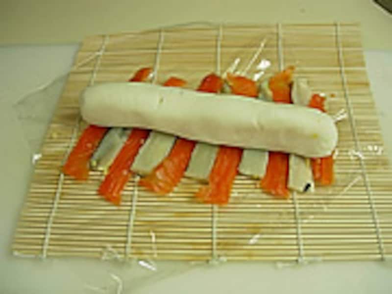 4・その上に細長く伸ばした大和芋をおき、のり巻きの要領で巻いていきます。 |