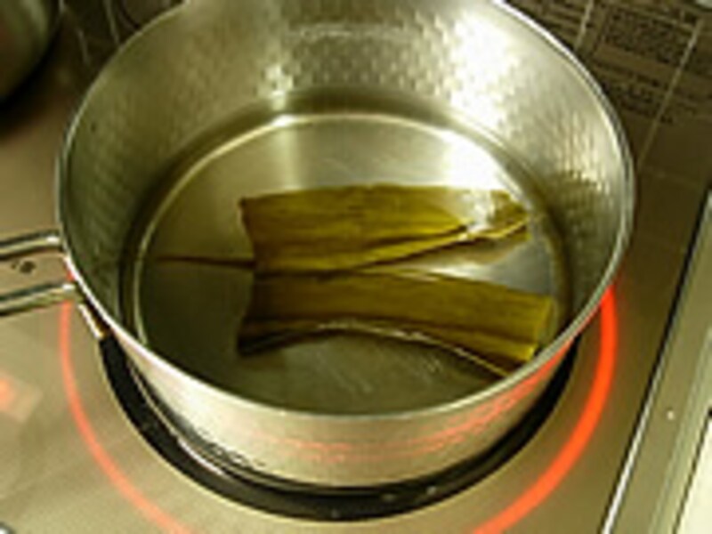 | 1・鍋に水800ccと8cm角のダシ昆布を入れ30分ほどおいてから火にかけます。鍋底がふつふつと沸騰し始めたら昆布を引き上げます。 |  | 2・昆布を引き上げ沸騰したところへ鰹節30gを入れ1分ほど煮て火を止めます。 |