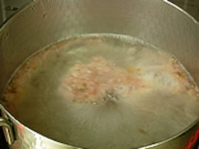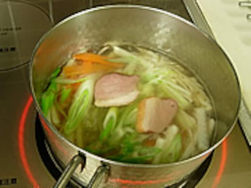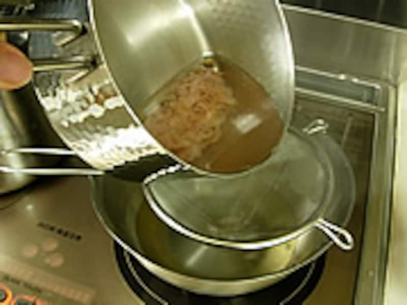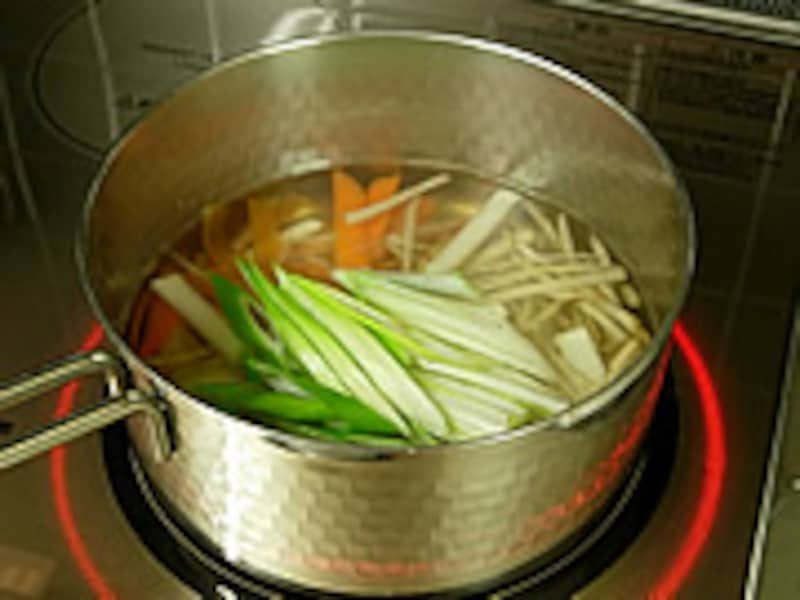 | 3・ざるに濾します。一番ダシができました。お吸い物などに使う一番だしが、このお雑煮の基本です。 |  | 4・だし汁に塩を加え大根、ごぼう、人参の順に煮て最後にネギを加えて煮ます。 |