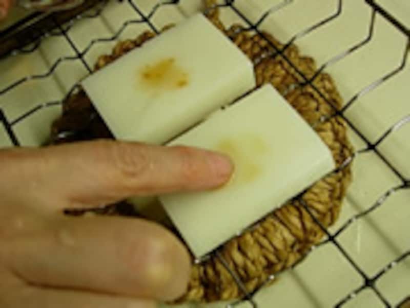 | 5・スモーク鴨肉を入れ、水溶き片栗粉を回しかけ火を止めます。 |  | 6・お餅の中心に醤油を塗りお餅を焼きます。こうするとお餅のまん中だけプクッとふくらんで焼けます。 |