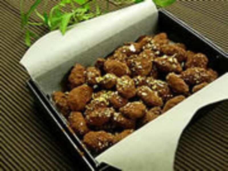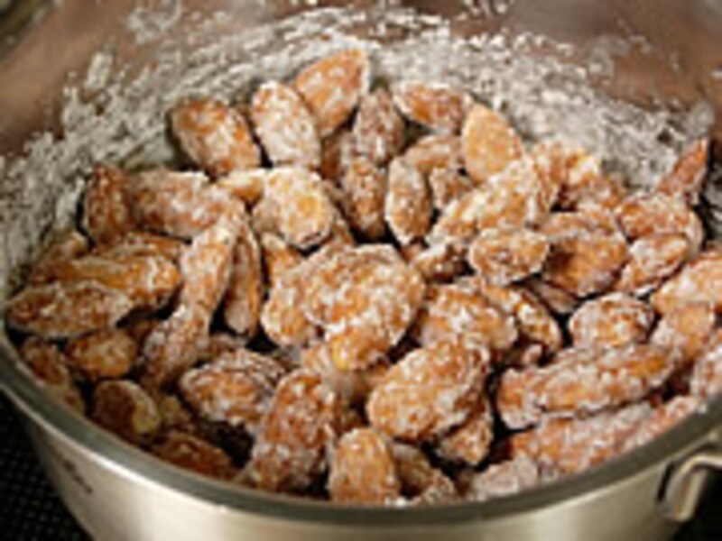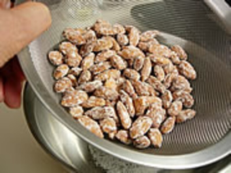 | 5・アーモンドを金網に移して軽くふるい余分な砂糖を取ります。 |