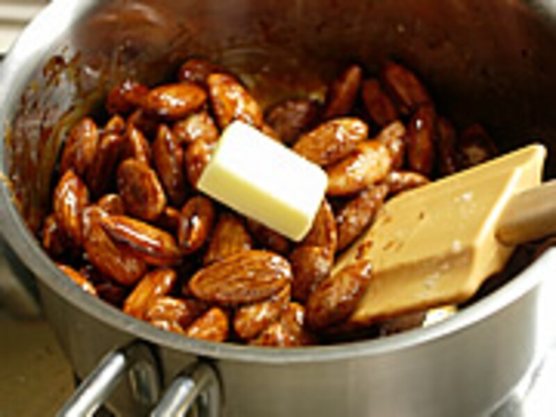 6・鍋を一度きれいにしてから中火で熱し、アーモンドを入れ、アーモンドの表面がキャラメル色になるようにゆっくりかき混ぜます。 |
