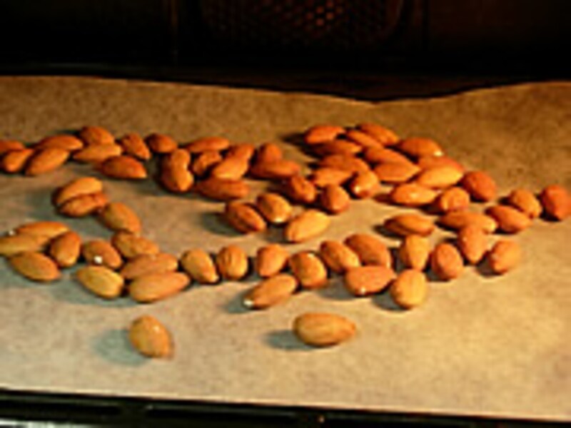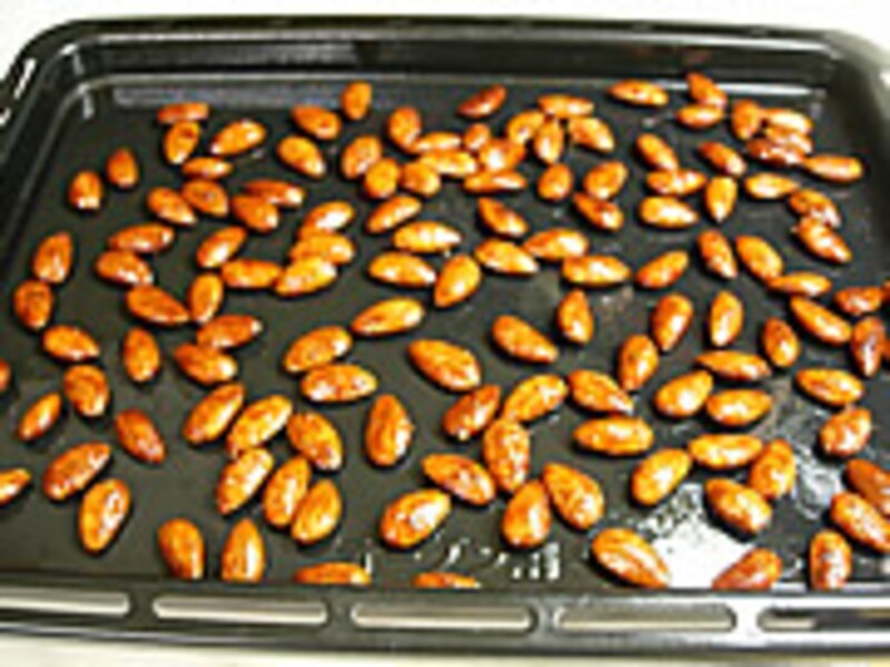 8・サラダ油をひいた天板にキャラメリゼしたアーモンドを一粒ずつ広げて冷まします。 |