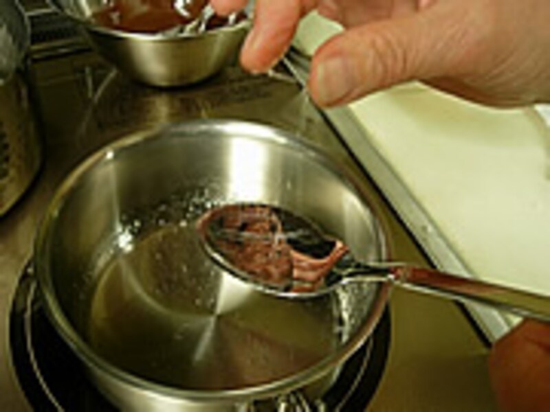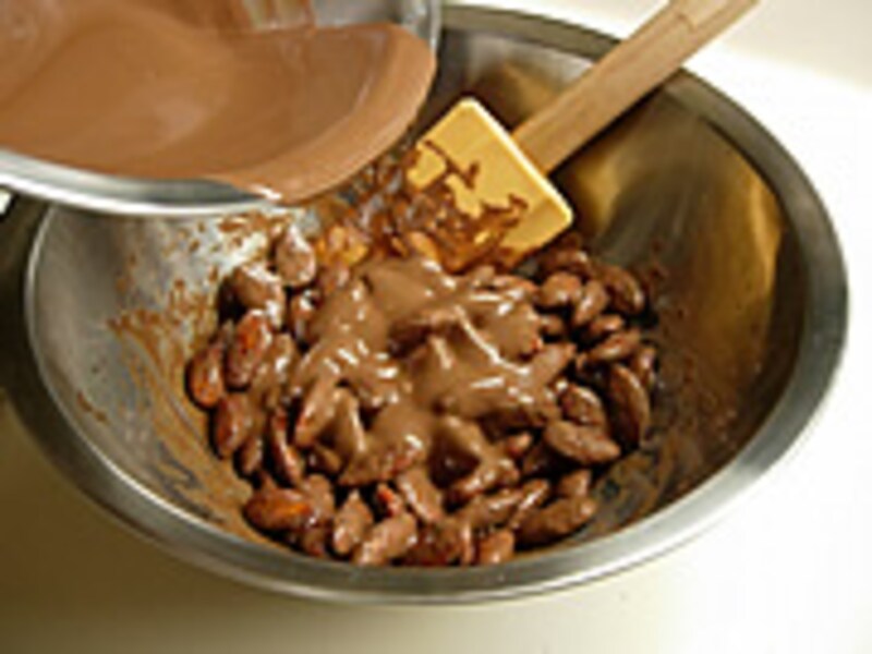 | 9・大豆くらいに砕いたスイートチョコレートをボウルに入れ45度の湯せんで溶かします。次にボウルの底を水につけかき混ぜながらチョコレートの温度を27度に下げます。再びボウルを熱湯につけて(2~3秒くらい)チョコを29度に上げます。これがチョコを安定させるテンパリングです。 | 10・キャラメリゼして冷ましたアーモンドにテンパリングしたチョコを大さじ1ほど加えかき混ぜます。固まったら再度チョコを加え混ぜあわせます。これを数回繰りかえしチョコの層を厚くします。これでほぼでき上がりです。一粒つまんでみてください。素敵な味になっていますね♪ | |