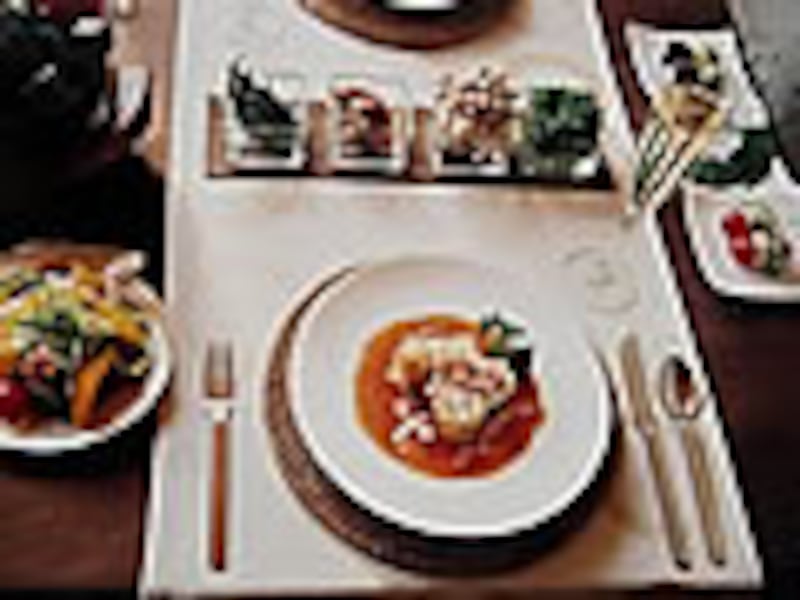 献立:黄パプリカのムース。ジャコ貝のエスカルゴ風。イカとたこのマリネ、マンゴーミントソース。あさりとズッキーニのリングイネ。スカンピのグリル、温野菜添え。クラウンベリーのバスケット。微発泡のビオワイン。スパーリングWATER | |