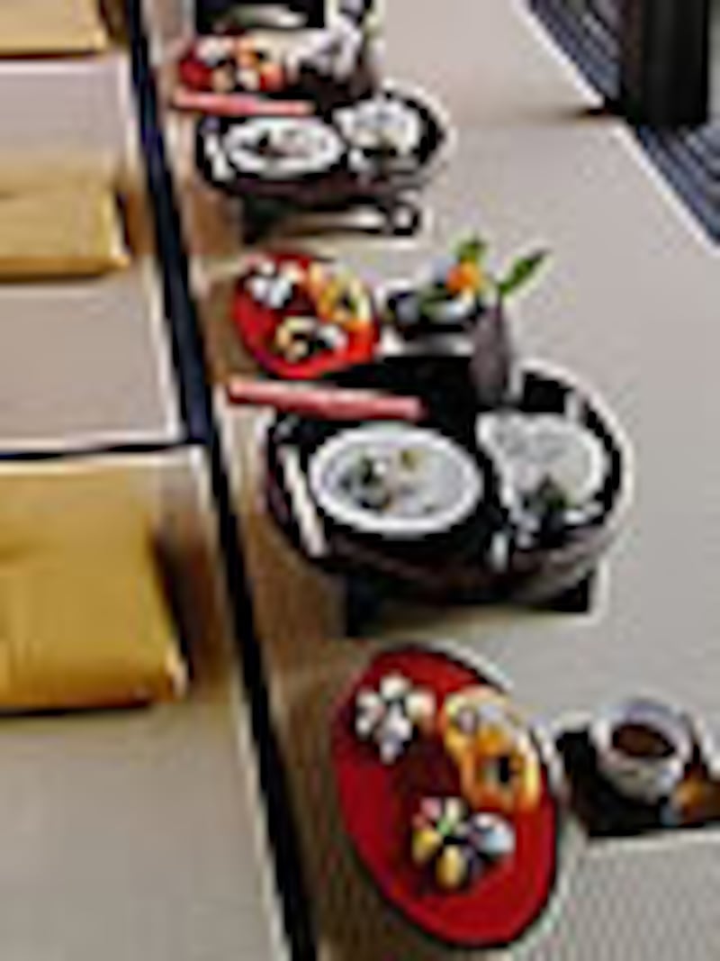 献立:萩ご飯(新銀杏、大納言小豆)。漬物(胡氏糠漬、奈良漬)。汁、上澄み仕立て(焼ナス、松茸、海老葛叩き、生麩、春菊)。柿白和え(柿、椎茸、蟹、三つ葉、松の実)、玉子焼き、すだれ麩いなり。ばい貝旨煮。結びかまぼこ。小芋。枝豆。焼しめじ。栗焼き。鮎甘露。菊甘酢。 | |