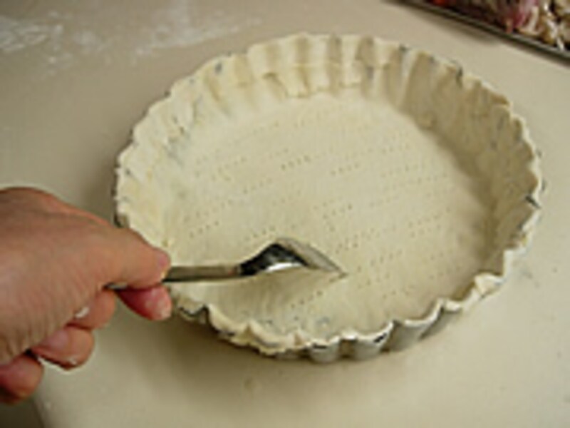 | 1・20cm径の型に薄くサラダ油を塗っておきます。 冷凍パイシートは冷凍庫から出し、伸ばしやすい柔らかさになったら 台の上に強力粉を振りかけ麺棒で25cmの丸型に伸ばします。縁を立ち上げるようにパイシートを型にはりつけます。底面はフォークで穴をあけておきます。 |