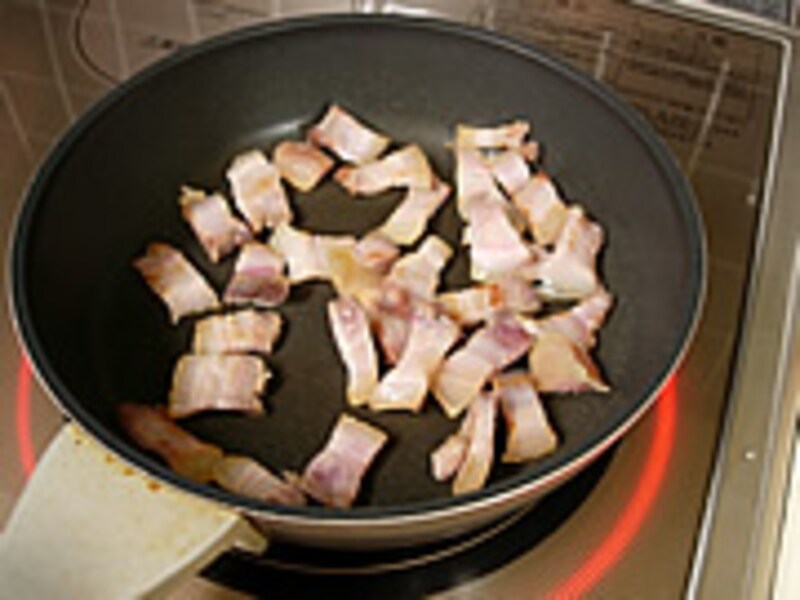 2・フライパンで細切りをしたベーコンを炒めます。(ベーコンから油が出るのでサラダ油は使いません) | |