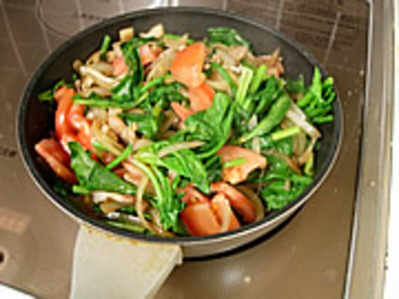 | 3・次に玉ねぎを炒め、しめじを炒め、ほうれん草を炒めしんなりしてきたらトマトを加えてさっと炒め、塩、コショウ、ナツメグで味を整えます。 バットに広げ冷ましておきます。 |